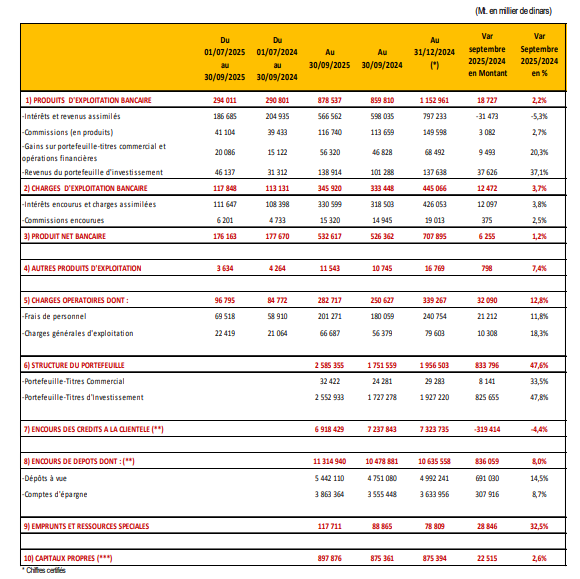 Les produits d’exploitation bancaire ont enregistré une progression de 2,2% par rapport au 30 Septembre 2024 pour s’établir à 878,5 millions de dinars au 30 Septembre 2025.