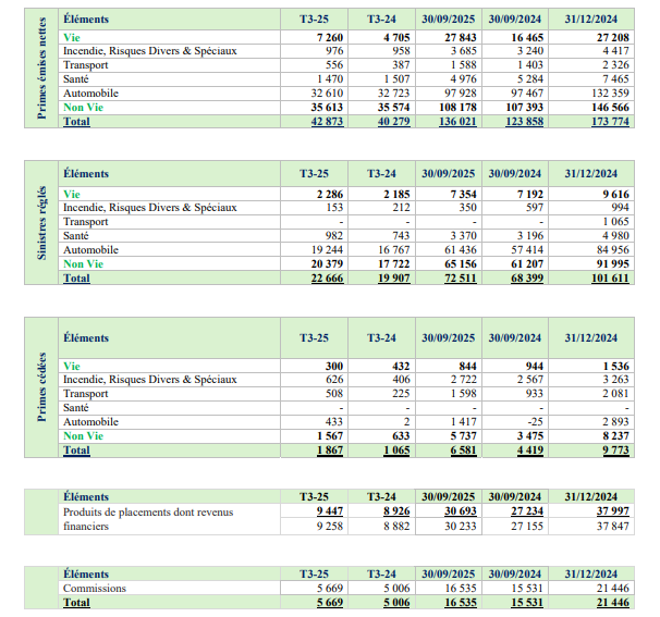 Les primes émises vie affichent une croissance de 69.1%, passant de 16.4 MDT au 30.09.2024 à 27.8 MDT au 30.09.2025, soit une augmentation de 11.3 MDT.