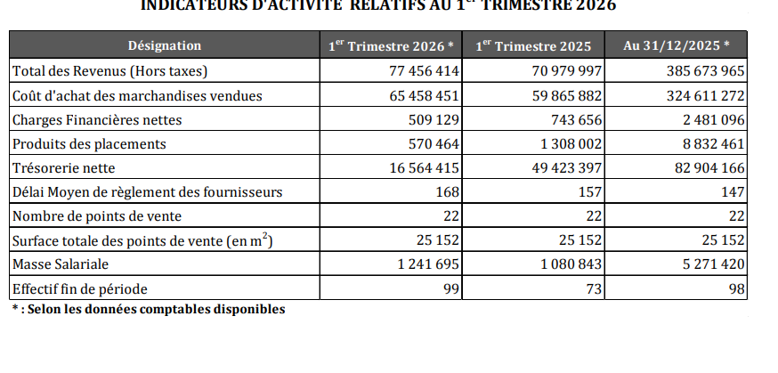La société CITY CARS a publié ses indicateurs d’activité relatifs au 1er trimestre 2026, les revenus se sont élevés à 77,456 MD contre 70,980 MD durant la même période en 2025, affichant ainsi une progression de 9,1%.