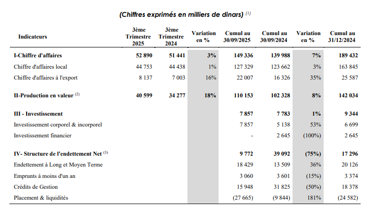 Au terme des neuf premiers mois de l’année 2025, le chiffre d’affaires enregistre une augmentation de 7% par rapport à la même période de 2024, due principalement à la reprise de la croissance sur le marché export.