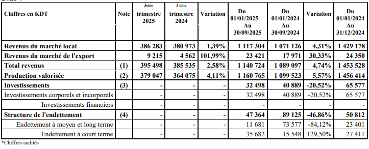 Les investissements réalisés au 30 septembre 2025 se sont élevés à 32,5 MD. Ces investissements ont principalement porté sur l’augmentation des capacités de production, l’amélioration de la productivité ainsi que sur le renforcement du parc roulant destiné au pôle distribution.