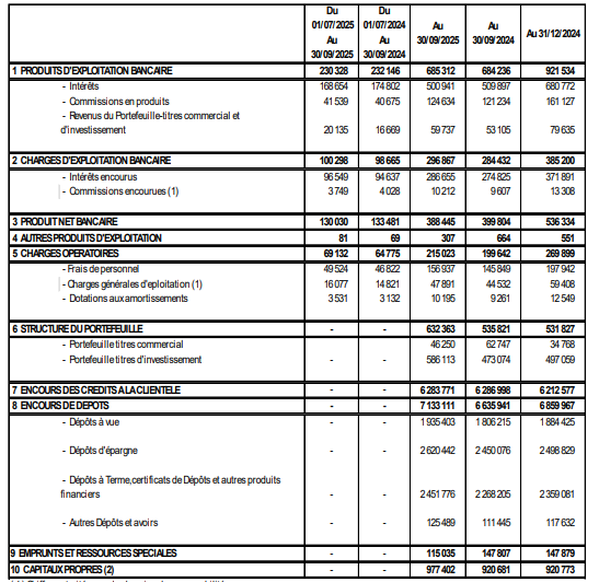 - Les charges opératoires - qui sont en hausse de +7,7% - s’élèvent à 215 MTND à fin septembre 2025 vs 199,6 MTND à fin septembre 2024.
