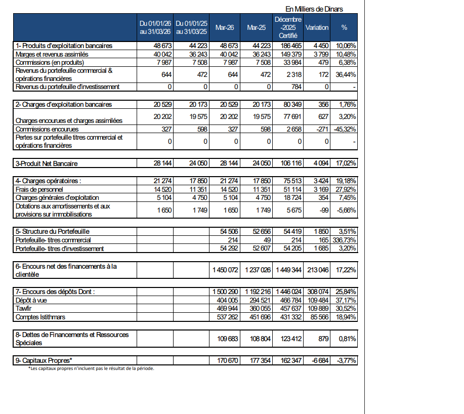 A la fin du 1er trimestre 2026, les indicateurs d’activité de Wifak Bank se présentent comme suit :