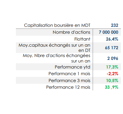 L’Assemblée Générale Ordinaire du 17 avril 2026 a validé un dividende de 2,400 DT par action, correspondant à un rendement de 7,2% par rapport au cours actuel, parmi les plus élevés du marché. Le détachement est prévu pour le 22 avril. Le management affiche une volonté claire de maintenir une politique de distribution soutenue à moyen terme.