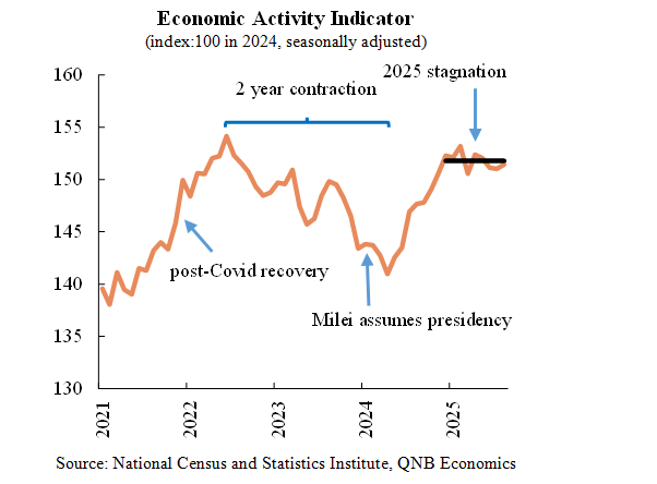 The fiscal adjustment has not been painless. After a sharp initial rebound from two years of recession in 2024, growth has stalled. Stagnant economic performance raised doubts about voter support before the recent mid-term elections. The political strain deepened when the Peronists secured victory in Buenos Aires in local elections in September this year, unsettling markets, with the currency depreciating and spreads on sovereign bonds rising sharply. Amid the turmoil, Milei turned to his ally US President Donald Trump, and a USD 20 Bn currency-swap package helped stabilize the peso and calm capital outflows.