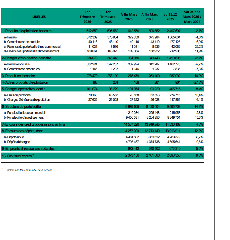 Le produit net bancaire s’est établi à 278 millions de dinars au 31 mars 2026 contre 253 millions de dinars au 31.03.2025, inscrivant ainsi une augmentation de 10%.