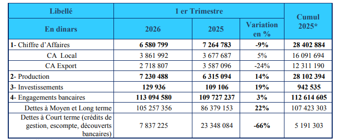 Les engagements bancaires s’établissent au 31/03/2026 à 113 095 mDT contre un total de 112 615 mDT à la fin de l’année 2025.L’ augmentation de capital a été réalisée en décembre 2025, la restructuration des dettes bancaires est en cours mise en place, après obtention des accords et autorisations nécessaires.