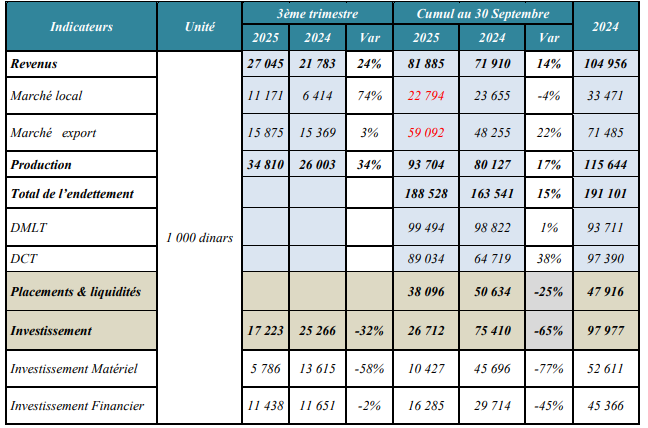 Au 30 septembre 2025, l'endettement global de la société s'élevait à 188,528 millions de dinars, soit une augmentation de 15% par rapport aux engagements fin septembre 2024.