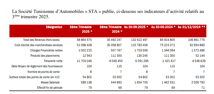 Selon les indicateurs d'activité de la STA, au 30 septembre 2025, le nombre d'immatriculations s'est élevé à 2985 véhicules, soit une augmentation de 69,22% comparativement aux immatriculations enregistrées au cours de la même période en 2024 (1764 immatriculations). Cette performance a été réalisée grâce à la nouvelle dynamique commerciale au niveau de la Société Tunisienne d’Automobiles (STA) et de son réseau de distribution.