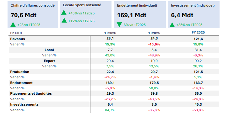 À l’échelle du groupe, les revenus consolidés atteignent 70,6 MDT (+23%), traduisant la montée en puissance du périmètre consolidé et validant la pertinence de la stratégie d’intégration.